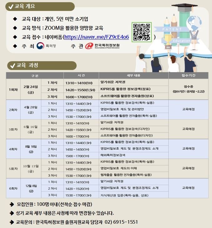 지식재산권과 관련된 폭넓은 교육기회를 제공하고자 [지식재산권 무료 교육]을 개최하오니,