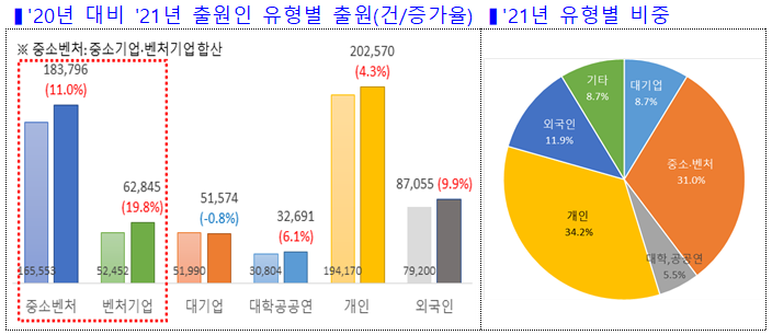 지난해 중소·벤처기업이 전년대비 11% 늘어나며 출원 증가세를 주도했는데, 이는 우리기업들이 코로나19 등 어려운 경제 여건에도 지식재산 확보에 적극 나선것으로 풀이된다.